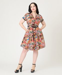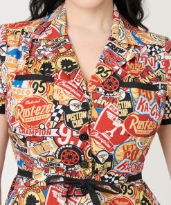 Life is a highway! This adorable dress. in collaboration with Disney Pixar Cars and made by Unique Vintage. is crafted in a lightweight woven cotton. and set in an all over patch print. The flattering fit and flare silhouette accentuates your curves while keeping things comfy. A chic self-tie belt cinches at your waist. adding a touch of femininity to this vintage-inspired beauty with charming black buttons down the front. Complete with side pockets!