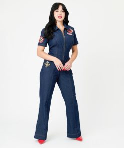 This retro jumpsuit. from Disney Pixar Cars and Unique Vintage. features a sleek front zipper and accented with custom Cars artwork patches. Crafted from high-quality denim. the classic dark wash pairs effortlessly with any accessories. Plus. with convenient side pockets. you can keep your essentials close at hand!