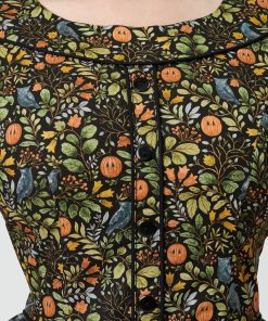 This darling dress from Retrolicious is crafted in black cotton and features a fall floral print switch owls and pumpkins throughout. Complete with a faux button bodice. back zipper. and side pockets!