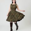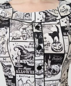 This spooky dress from Retrolicious is crafted in cotton and set in an black and white all over print of spooky newspaper articles. Complete with a faux button bodice. back zipper. and side pockets!