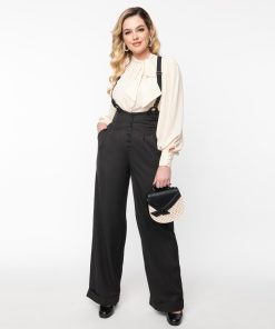 Get the gang together. dolls! Stay a step ahead of the fuzz with these fabulous suspender pants from Unique Vintage. boasting a jet black silhouette. Crafted in a marvelously woven fabric blend. the Thelma Pants feature a wide banded high waist cinched in with a darling button up front and secured by adjustable suspender straps. easily removable for versatile wear. Deep side pockets and wide legs with rolled cuffs make it easy to dust out!
