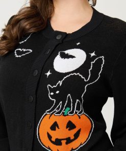 Crafted in a black sweater knit. this cardigan boasts a spooky print of bats. a jack-o-lantern. and a black cat. Complete with long sleeves and button front.