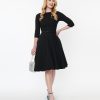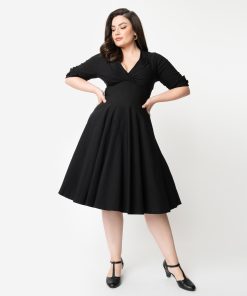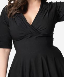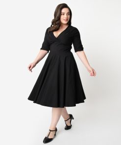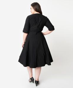 Let Delores get domestic with you. darling. A bewitching black frock rich in plus size 1950s vintage dress appeal fresh from Unique Vintage. Delores is unparalleled! Boasting a gathered surplice v-neckline. trim and tailored half sleeves with darling button detail and a thick banded natural waistline that creates a minimized silhouette. An ample A-line swing skirt billows to knee length in soft pleats. zipping slyly up the back. Crafted in a supremely soft stretch blend in stunning retro structure. forming an understated yet flattering design. Fabulously floored!