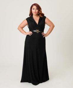 This stunning plus size maxi dress is crafted in a black knit fabric that shimmers with black lurex throughout. The V-neck line leads to a slouchy hood. all framed by cap sleeves. The fitted waist is nipped in by the matching black belt accented with a custom made snake set in golden hardware. while the maxi length skirt drops to your feet. Outfitted with a side zipper!