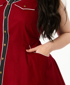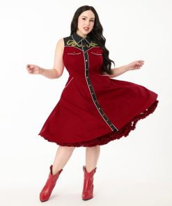 Lasso yourself a good time in this fabulous plus size western style flare dress! Crafted in burgundy cotton and accented with a black yoke with gold snakes embroidered. and piping throughout. this adorable dress features a button front. side and chest pockets and a flare silhouette!